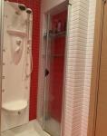 Household appliances: televisor, gas stove, gas oven, refrigerator, air vent, washing machine in the bathroom;