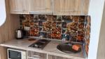 Household appliances: televisor, electric stove, microwave, refrigerator, air vent, washing machine in the bathroom;