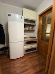 Household appliances: electric stove, refrigerator, washing machine in the bathroom;