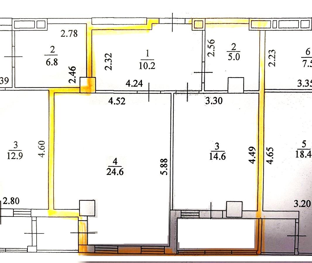 Загальна площа 58,1 кв.м: окрема кухня – 14,6 кв.м, ізольована кімната 24,6 кв.м, лоджія, суміжний санвузел 5 кв.м, просторий квадратний хол - 10,2 кв.м.