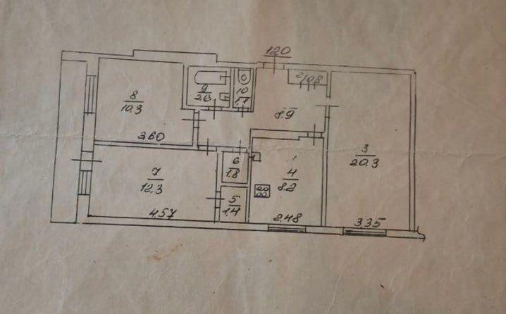 Загальна площа 71,1 кв.м: кухня 8,2 кв.м, три роздільні кімнати (12,3 кв.м, 10,3 кв.м та 20,3 кв.м), лоджія, роздільний санвузол.