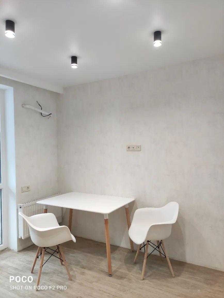 Формат квартири: кухня -вітальня + спальня.Загальна площа 45 кв.м. гостинна-17 кв.м, кухня 5 кв.м., спальня 11 кв.м.