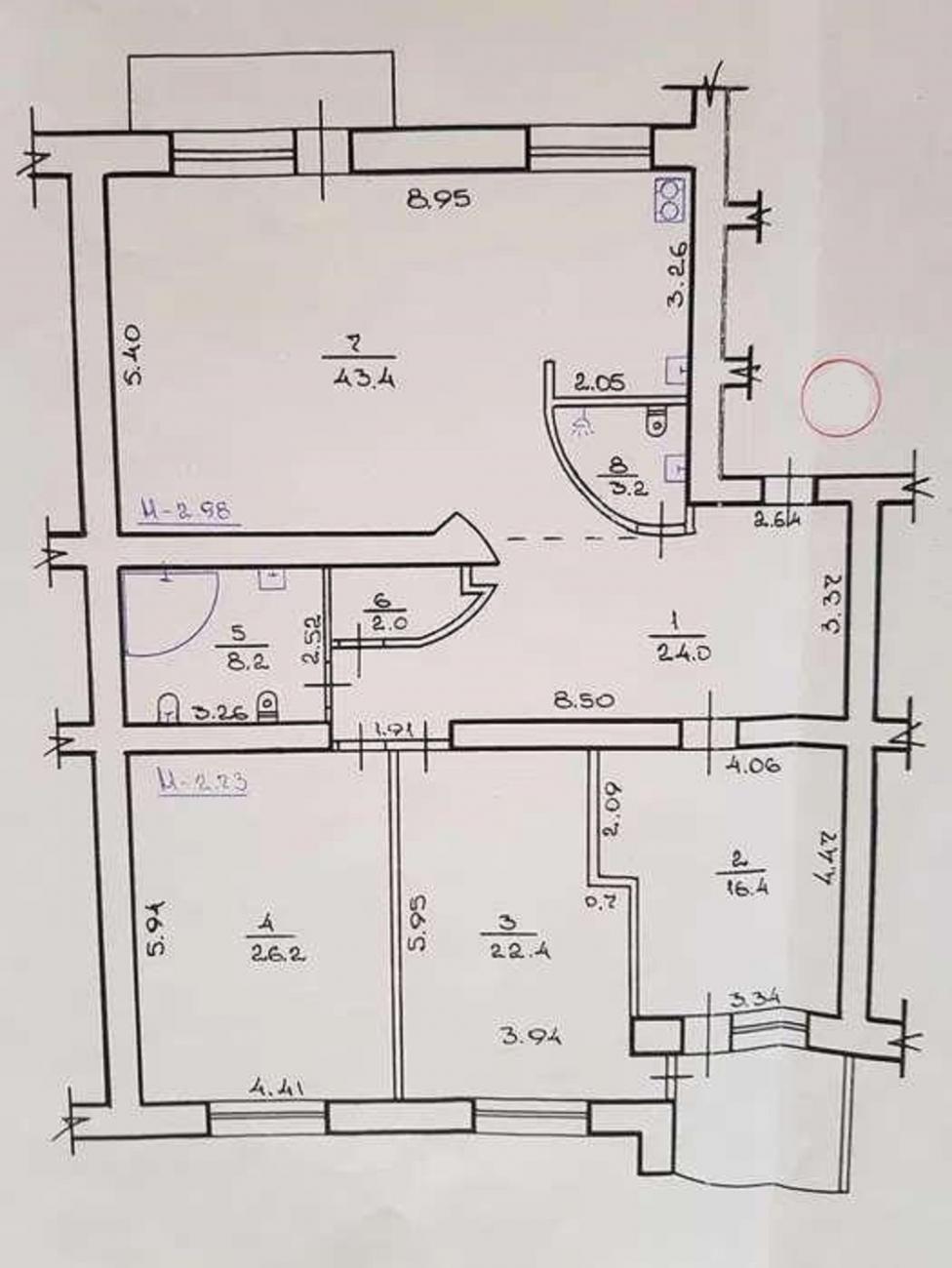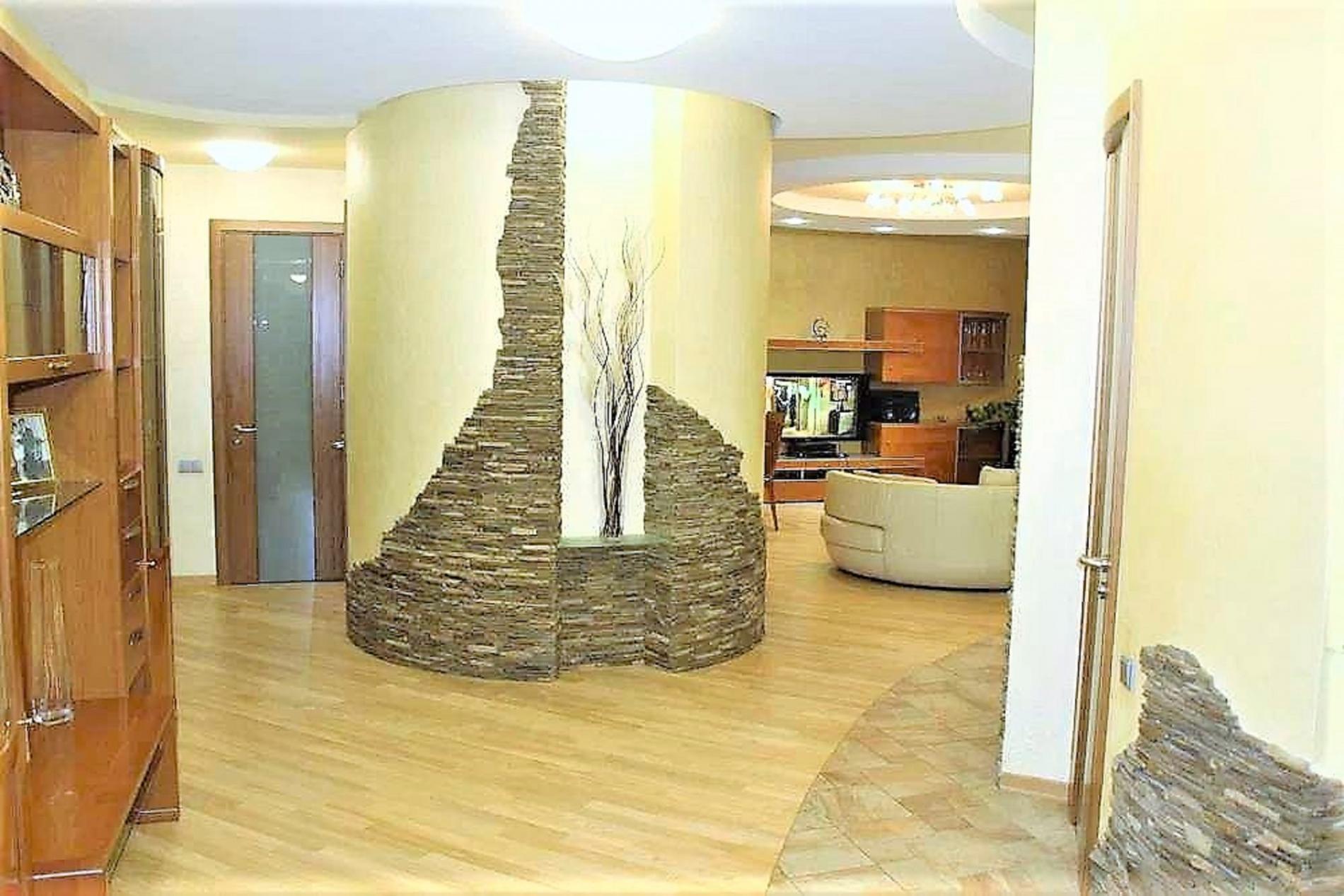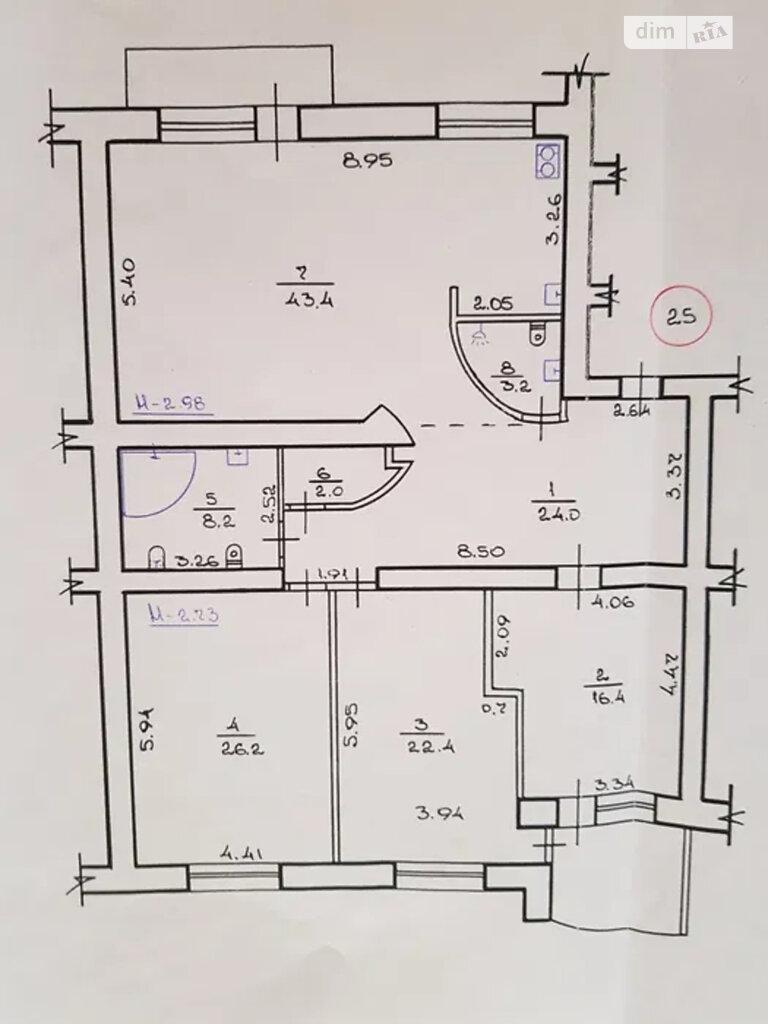 Загальна площа - 150 кв.м: кухня-студія 43 кв.м, три окремі кімнати (26+22+16) кв м, два санвузли, пральна, два балкони, передпокій (хол).