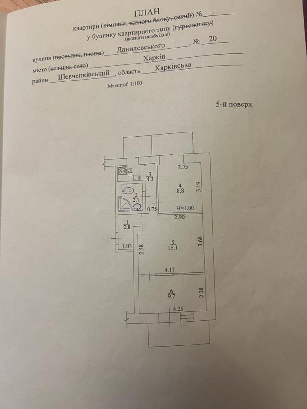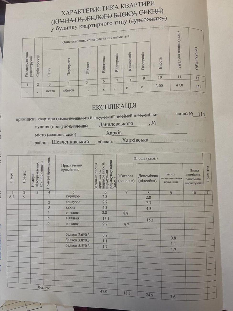 Загальна площа 47кв.м: кухня 5 кв.м, три окремі кімнати, суміжний санвузол, балкон, коридор.