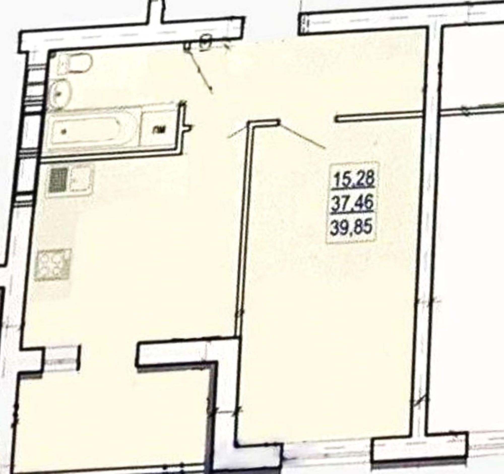 Загальна площа - 39,64 кв. м: кухня 14,5 кв.м, кімната 15,28 кв.м, суміжний санвузол, балкон 4,8 кв.м.