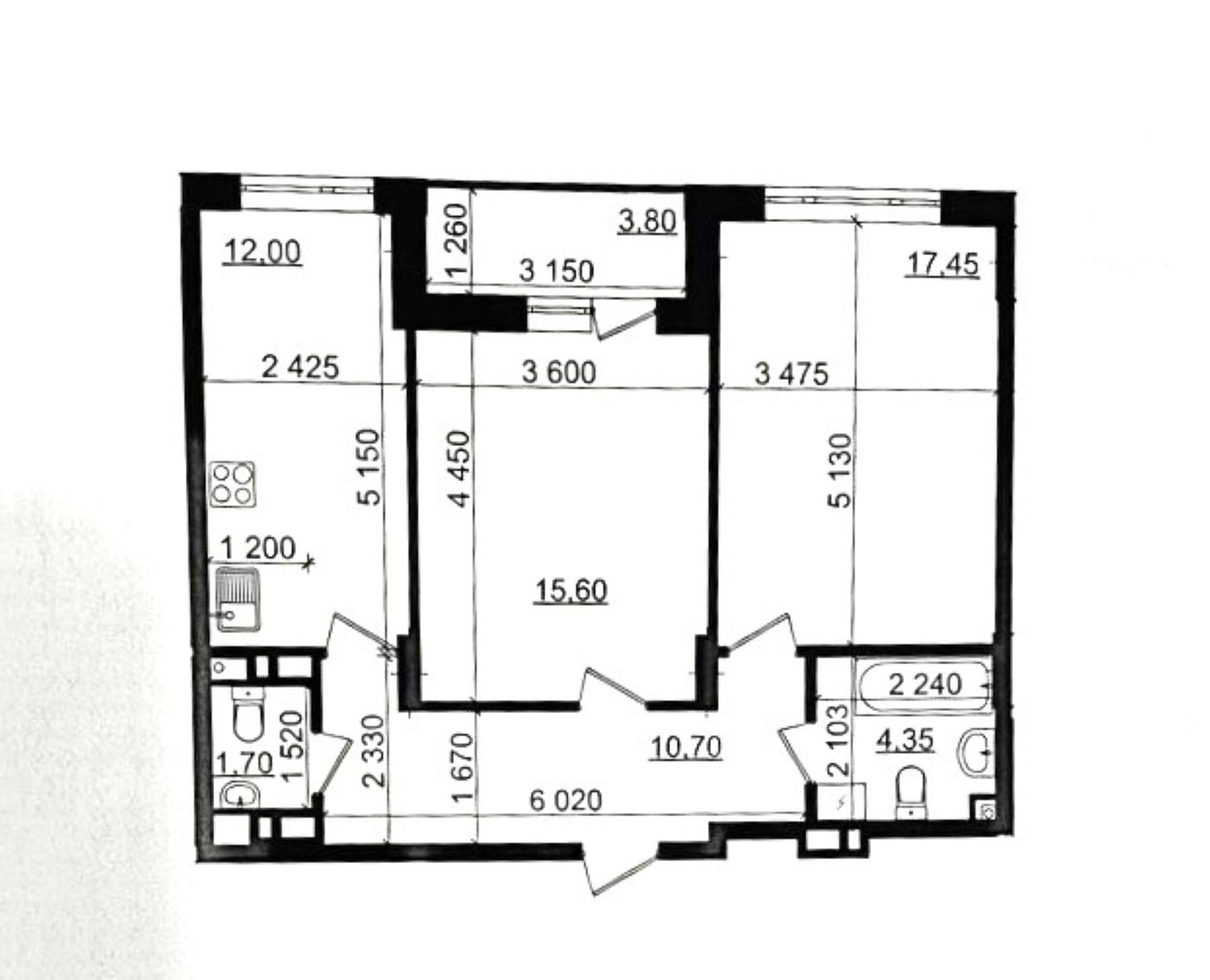 Загальна площа – 63,7 кв. м: кухня 12 кв.м, дві окремі кімнати, лоджія, два санвузли, передпокій.