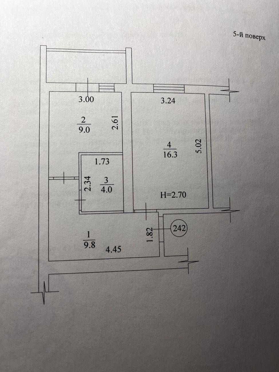 Квартира загальною площею 44 кв.м. Планировка: кухня - 9 кв.м., балкон, санвузол, передпокій, кімната-17 кв.м..