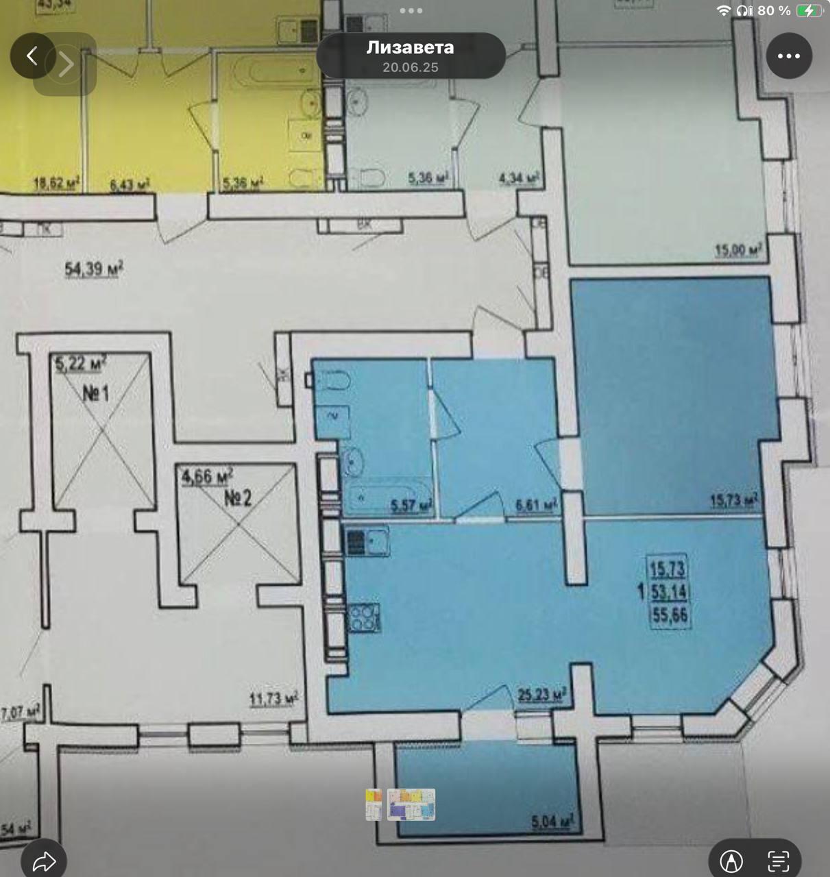 Загальна площа – 56 кв.м: кухня 13 кв.м, кімната-16 кв.м, кімната-16 кв.м, суміщений санвузол, балкон , передпокій.